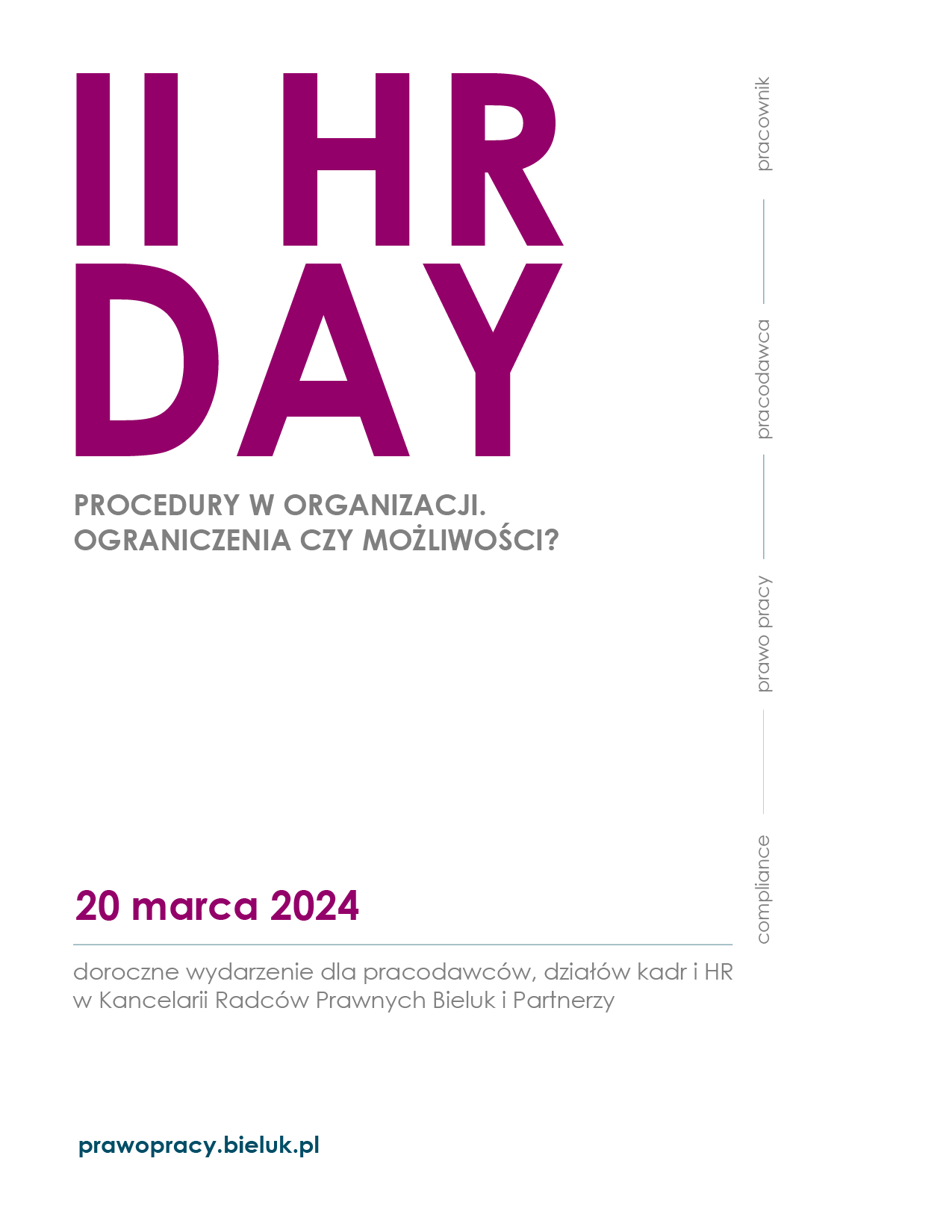 Ze względu na ograniczoną liczbę miejsc, obowiązuje rejestracja, a o uczestnictwie zadecyduje kolejność zgłoszeń. Prosimy o zgłaszanie maksymalnie dwóch osób z jednej firmy. Link do formularza rejestracyjnego: Formularz rejestracyjny HR DAY 20.03.2024 – Bieluk i Partnerzy