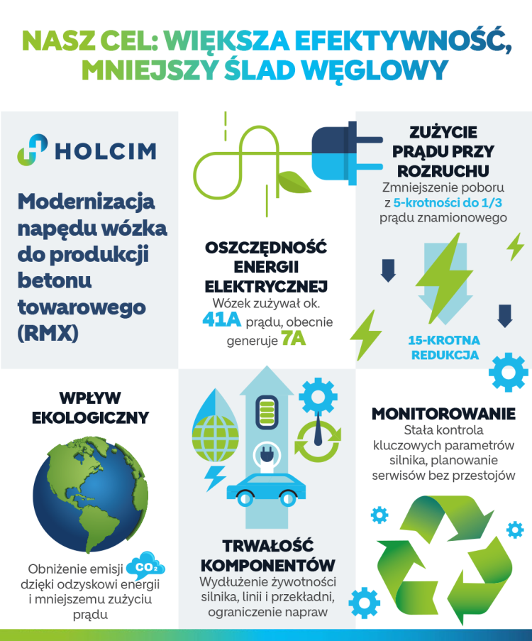 Wytwórnia betonu Holcim Polska w Krakowie jako pierwsza w kraju zastosowała nowatorskie rozwiązanie, które znacząco poprawia efektywność energetyczną oraz ogranicza wpływ na środowisko. Dzięki wdrożeniu przemiennika częstotliwości wraz z modułem zwrotu energii, zakład zmodernizował układ napędowy wózka jezdnego, służącego do produkcji betonu towarowego (RMX), osiągając wymierne korzyści ekonomiczne i ekologiczne.