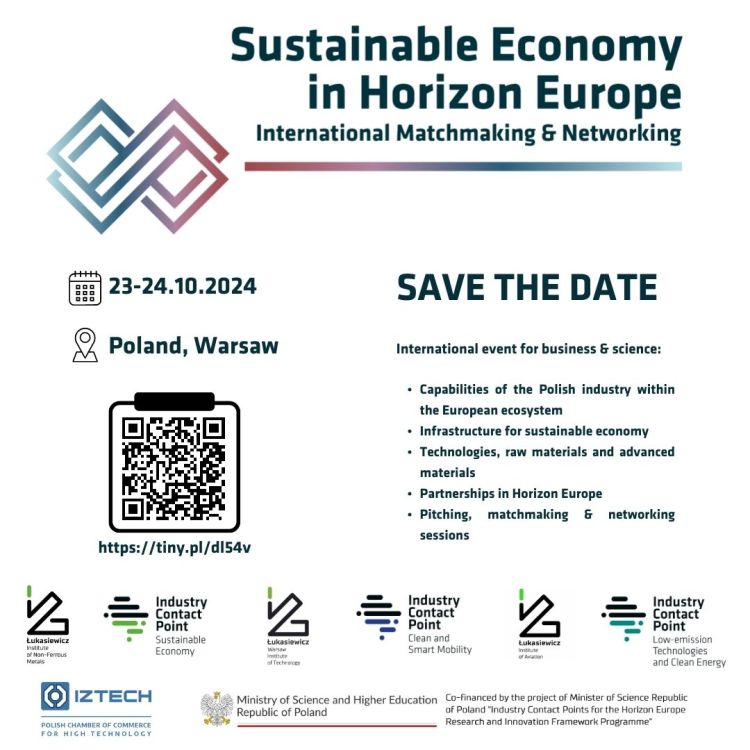 The event is organized by: Industry Contact Points: Sustainable Economy, Low-emission Technologies and Clean Energy, Clean and Smart Mobility, Polish Chamber of Commerce for Advanced Technologies, and Łukasiewicz Research Networks: Warsaw Institute of Technology, Institute of Non-Ferrous Metals, Institute of Aviation