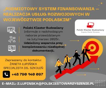 Polski Klaster Budowlany informuje o nadchodzącym naborze przewidzianym na luty/marzec 2025r. do projektu „Podmiotowy System Finansowania – realizacja usług rozwojowych w województwie podlaskim”. Nabór adresowany jest do mikro, małych i średnich przedsiębiorstw w województwie podlaskim oraz ich pracowników. Celem projektu jest wspieranie dostosowania kompetencji i kwalifikacji pracowników. Dofinansowanie do 85% kosztów usług rozwojowych! Udzielimy wsparcia przy […]